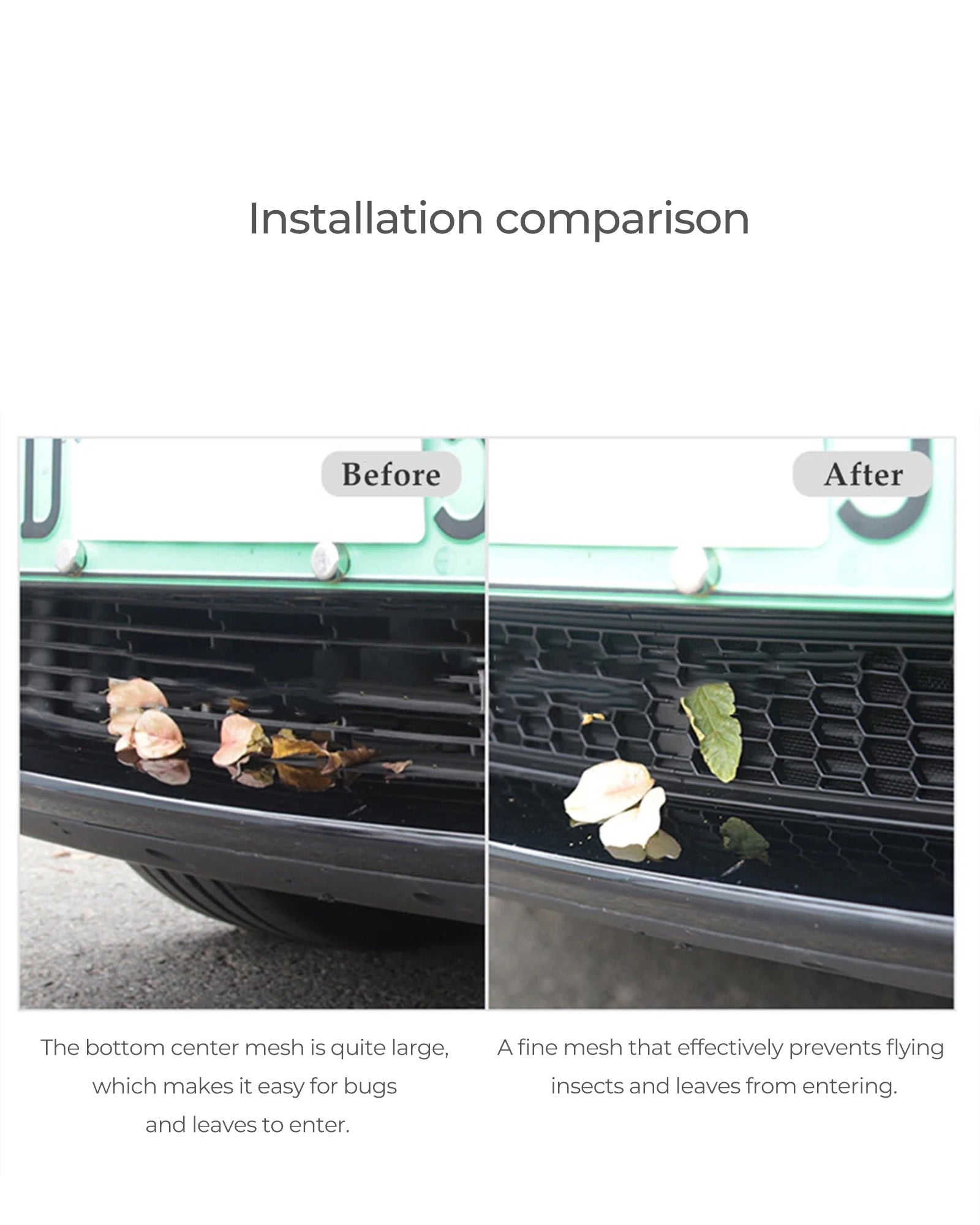Prevent leaves, insects, sand, and other debris from entering through the gaps in the front bumper, protecting the radiator from damage and maintaining its cleanliness.