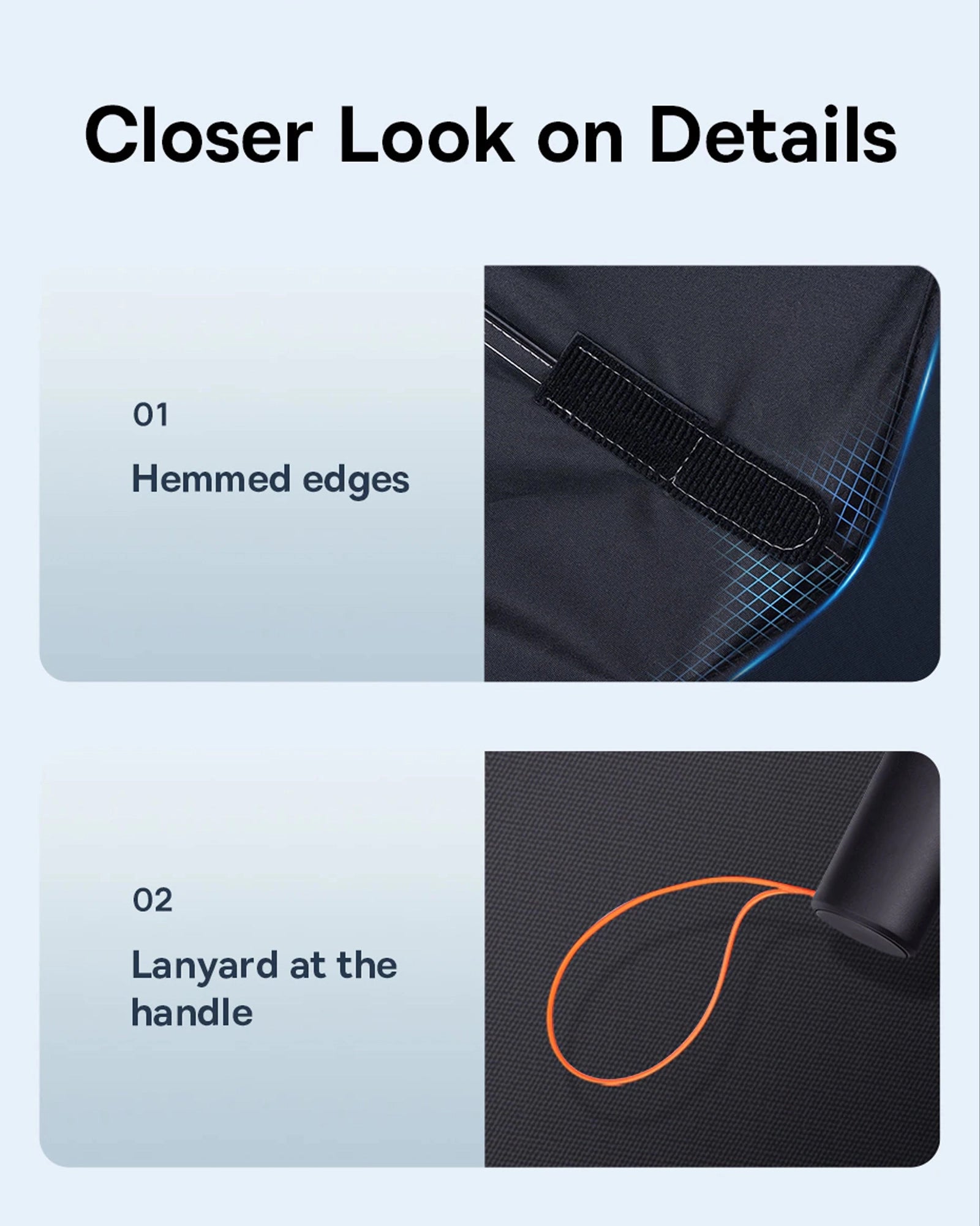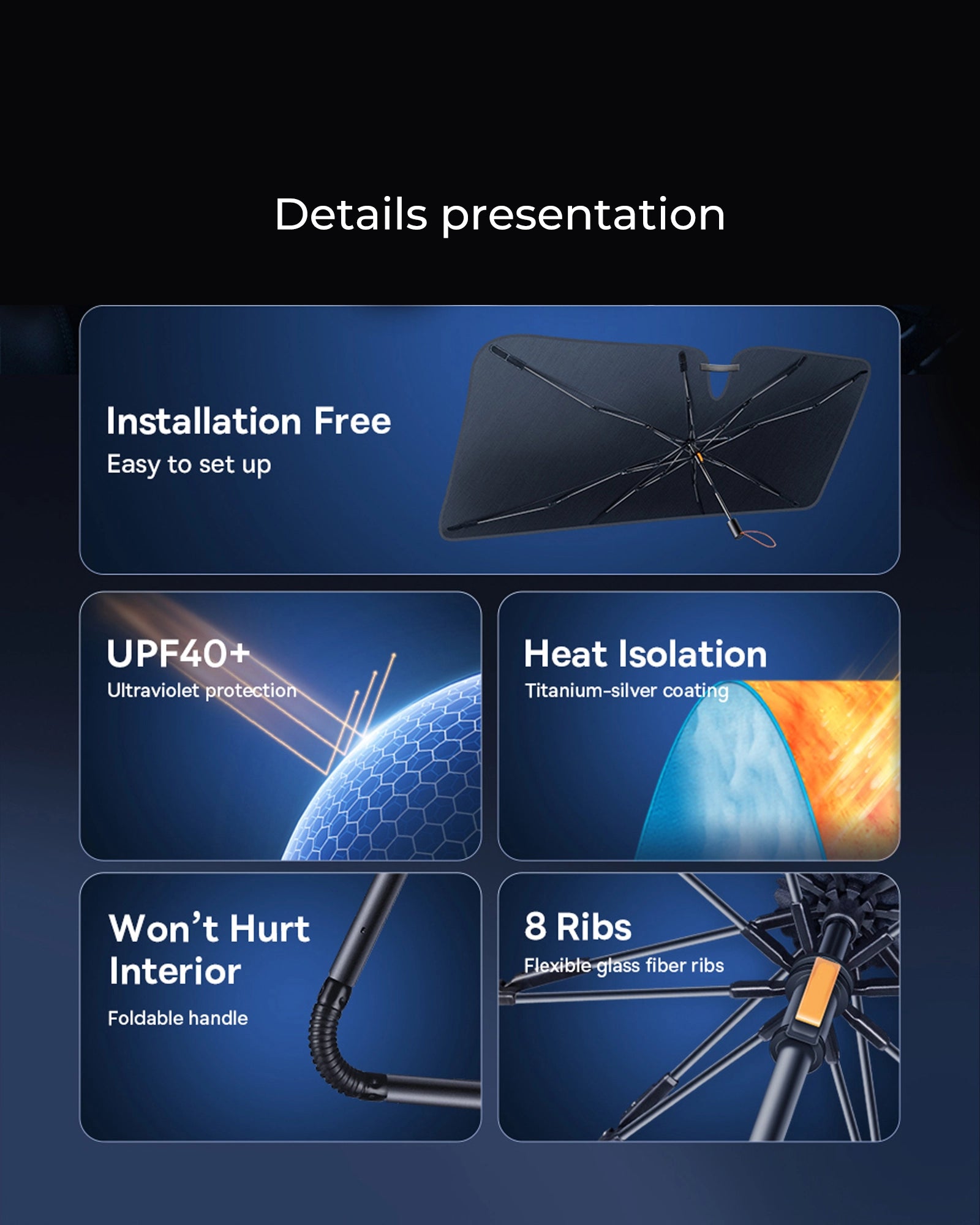 Crafted with high-density glass fiber ribs in a robust cobweb-like structure, this sun shield is built to last, ensuring longevity and toughness.