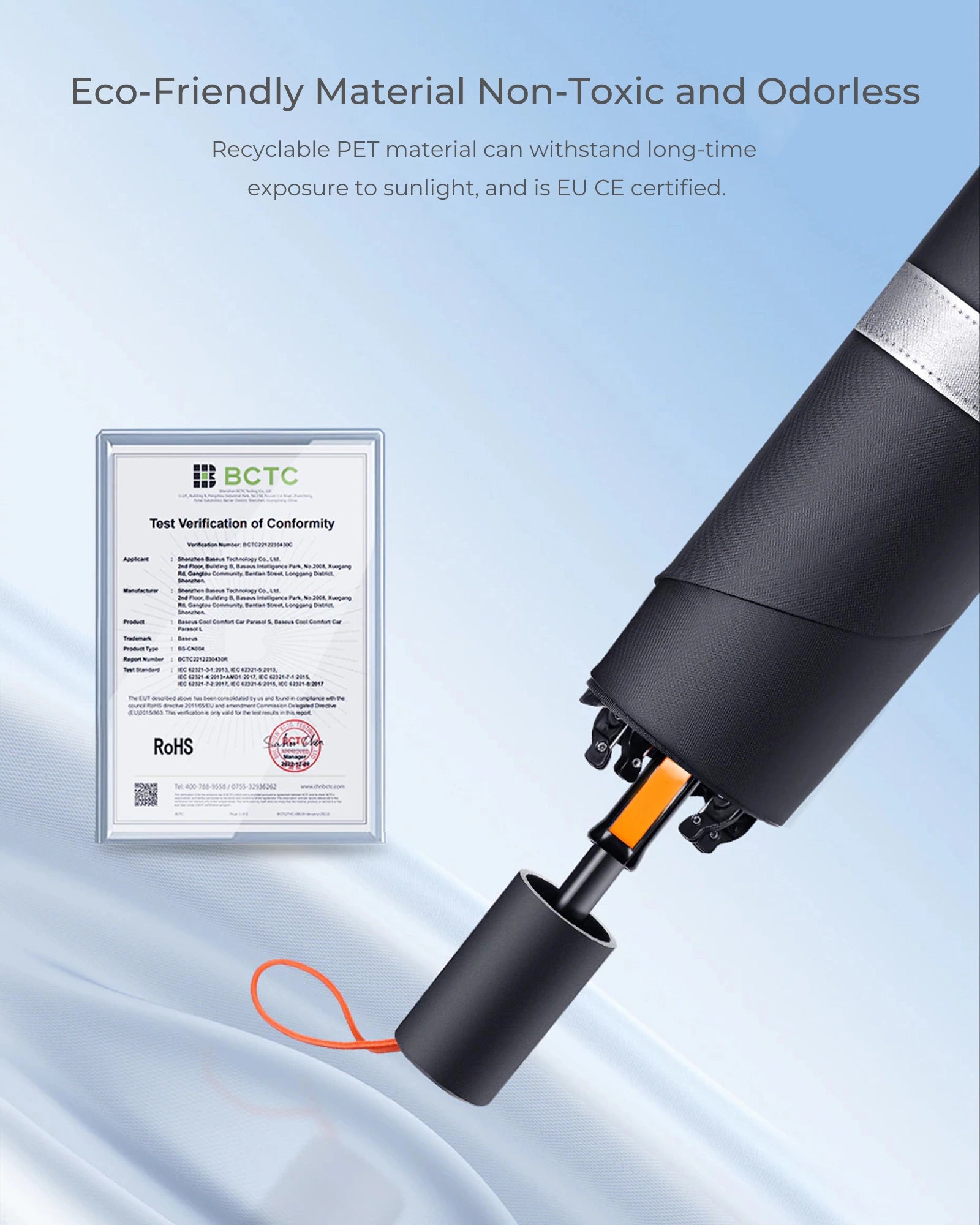 Made from eco-friendly and odorless PET material, this sun shield is not only recyclable but also EU CE certified, capable of withstanding prolonged exposure to sunlight.