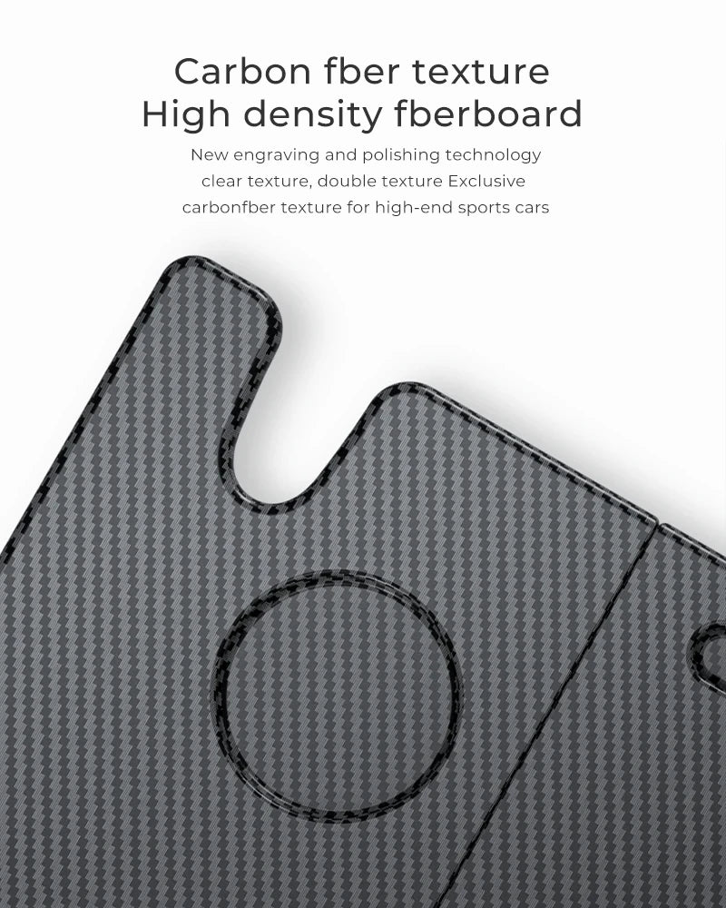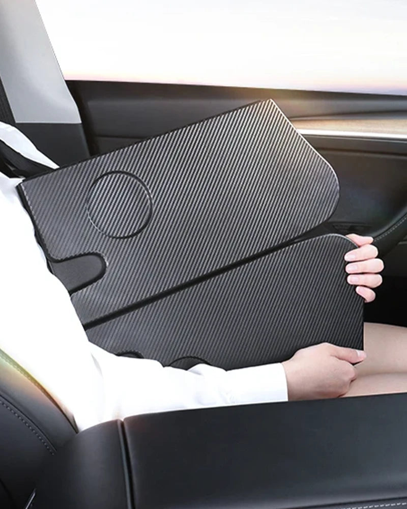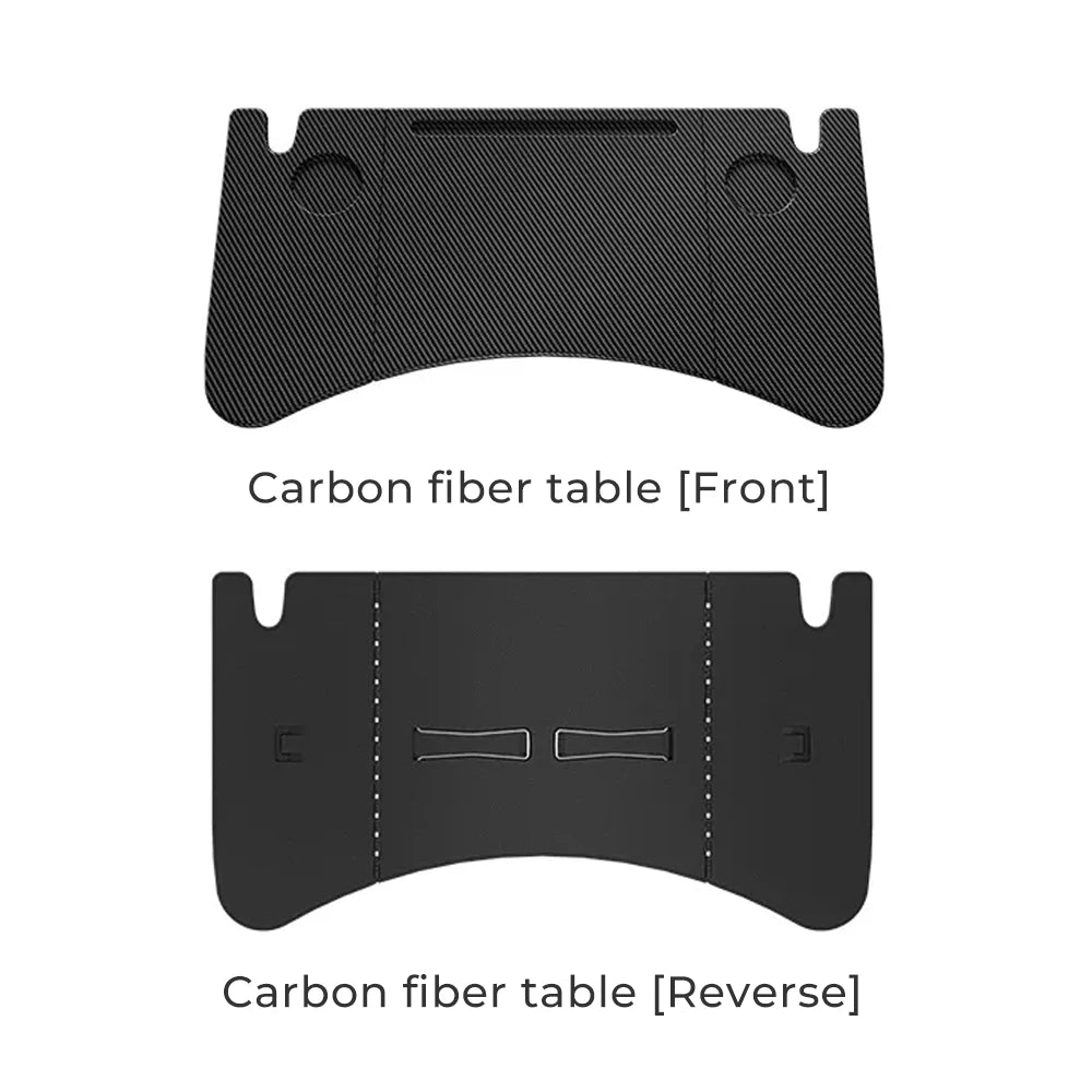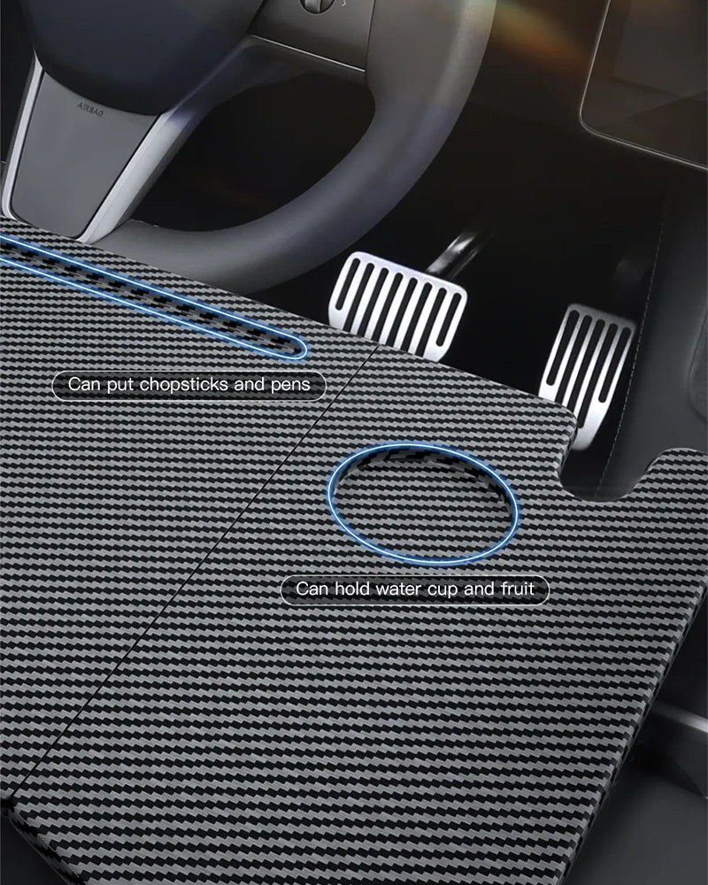 The design of this portable table tray takes into account user convenience and efficient utilization of car interior space. It provides a stable surface for accommodating cups and other items. The carbon fiber texture design adds a touch of sophistication to the car interior.