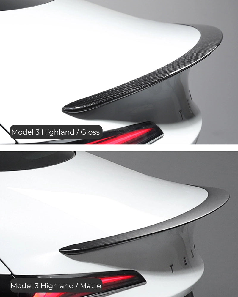 The spoiler boasts a transparent texture, a high gloss finish, and a smooth hand feel. It not only adds functionality but also complements the aesthetic of your Model 3 Highland.