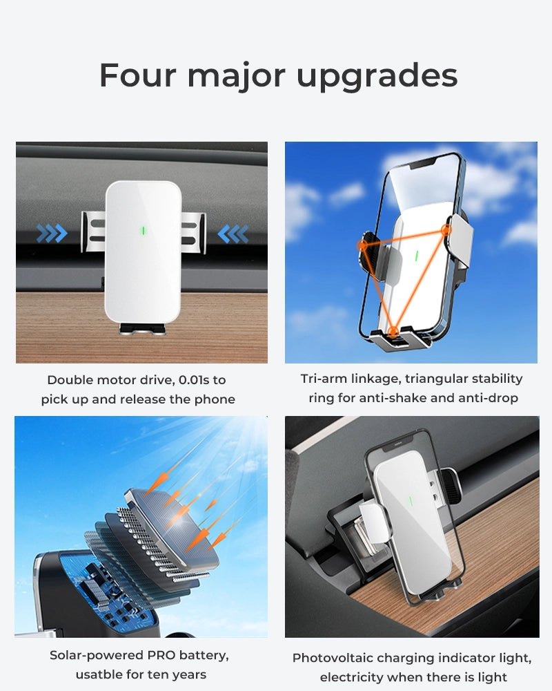 A solar-powered mobile device stand that liberates you from the constraints of traditional car mounts that require corded charging. This product, with its instant placement and retrieval, wireless automatic clamping, and adaptability to various scenarios, perfectly meets the needs of modern drivers.