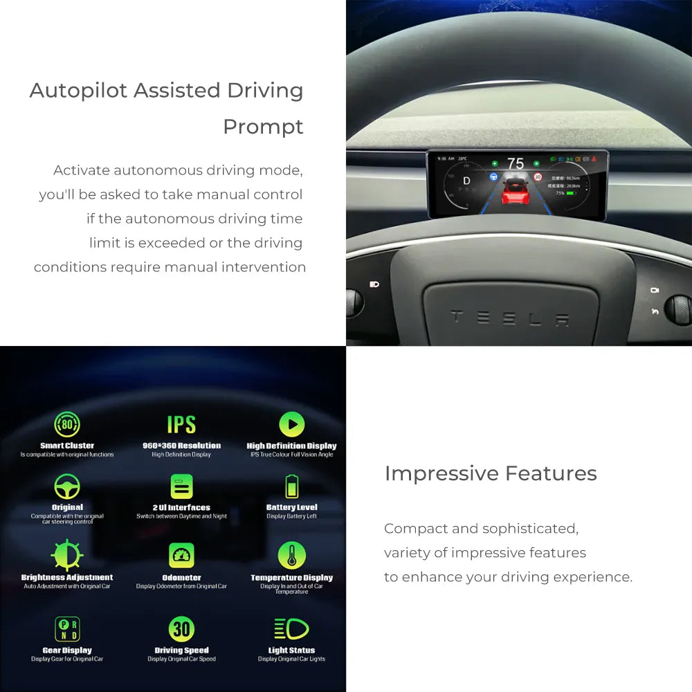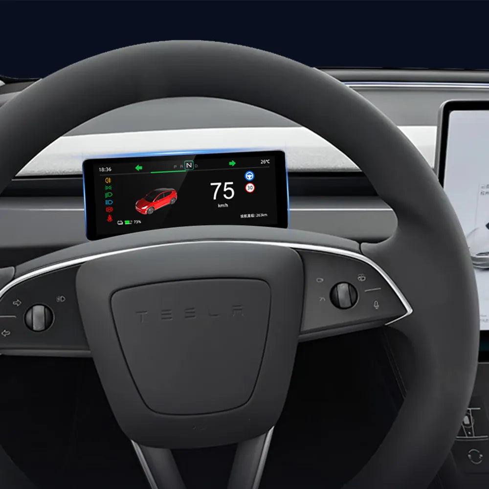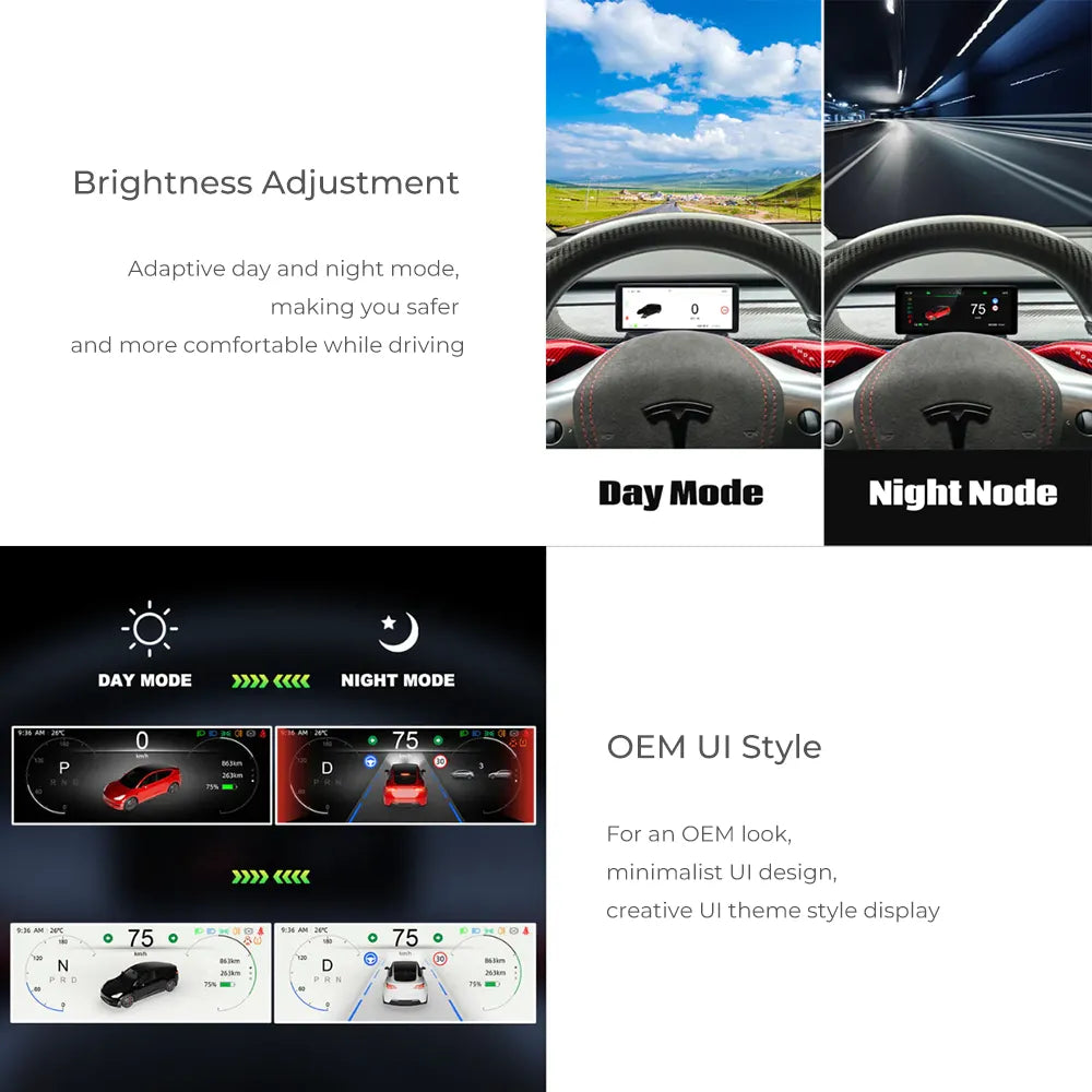 Dashboard Screen Display for Tesla Model 3 Highland & Model 3 (2017-2023) & Model Y (2020-2024). Refuse to look down and make driving safer—tight-fitting body design Multiple features. With a Tesla OEM-style UI interface that blends modern technology with classic black elements, it matches your Tesla Model Y and Model 3 perfectly. Unlike a regular dashboard display, the Display Dashboard Instrument for Tesla Model 3 / Model Y has excellent adaptive day and night mode!