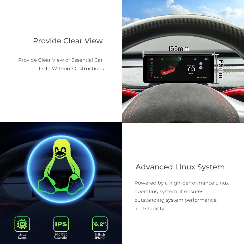 - Compatible Models - The 6.2-inch instrument dashboard display is specially customized for Tesla Model 3 Highland & Model 3 (2017-2023) & Model Y (2020-2023) compatible with Intel Atom or AMD Ryzen CPU.