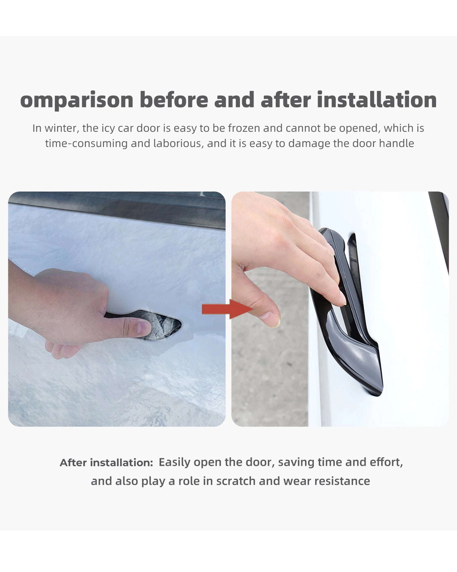 This door handle protector is crafted from anti-freeze material. It not only enhances the aesthetic appeal of the vehicle but also safeguards the door handles against the harshness of cold weather. We must acknowledge the impressive design of Tesla's door handles, which seamlessly blend style with technology. However, there are concerns that cannot be overlooked. The design is particularly prone to causing hand injuries, and in extremely cold temperatures, it may become difficult or even impossible to pull out the door handle or grasp it effectively. This could lead to various potential issues, hindering access to the vehicle. Hence, this product has been thoughtfully designed for those who not only admire classic design but also prioritize safety and ease of use.
