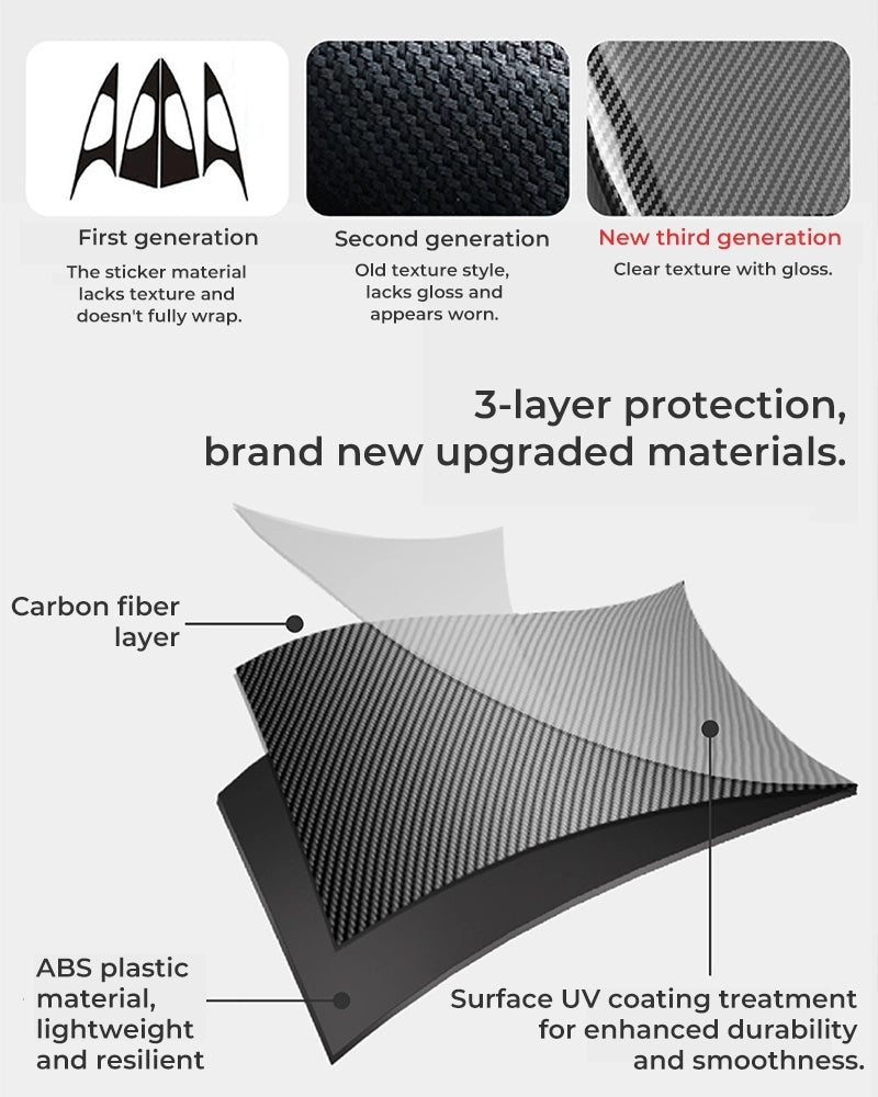The third-generation all-inclusive edge door sill strip from Teswing abandons the easily damaged sticker style and the easily worn pure carbon fiber style, adopting a newly upgraded material that provides triple protection. This product not only retains the carbon fiber's mid-texture but also adds a UV coating treatment to the surface, making it smoother and more wear-resistant. Additionally, the bottom of the door sill strip incorporates ABS plastic material, endowing the product with lightness and toughness.