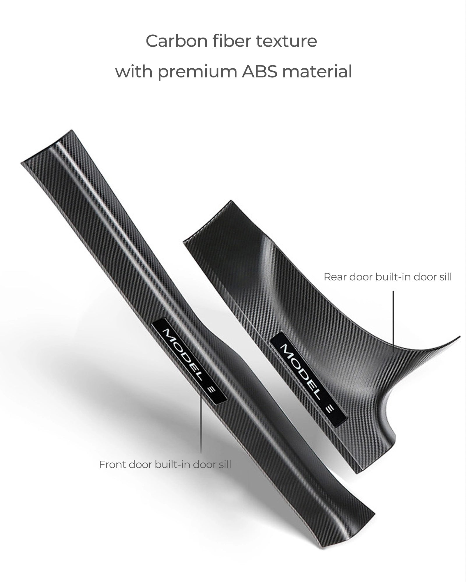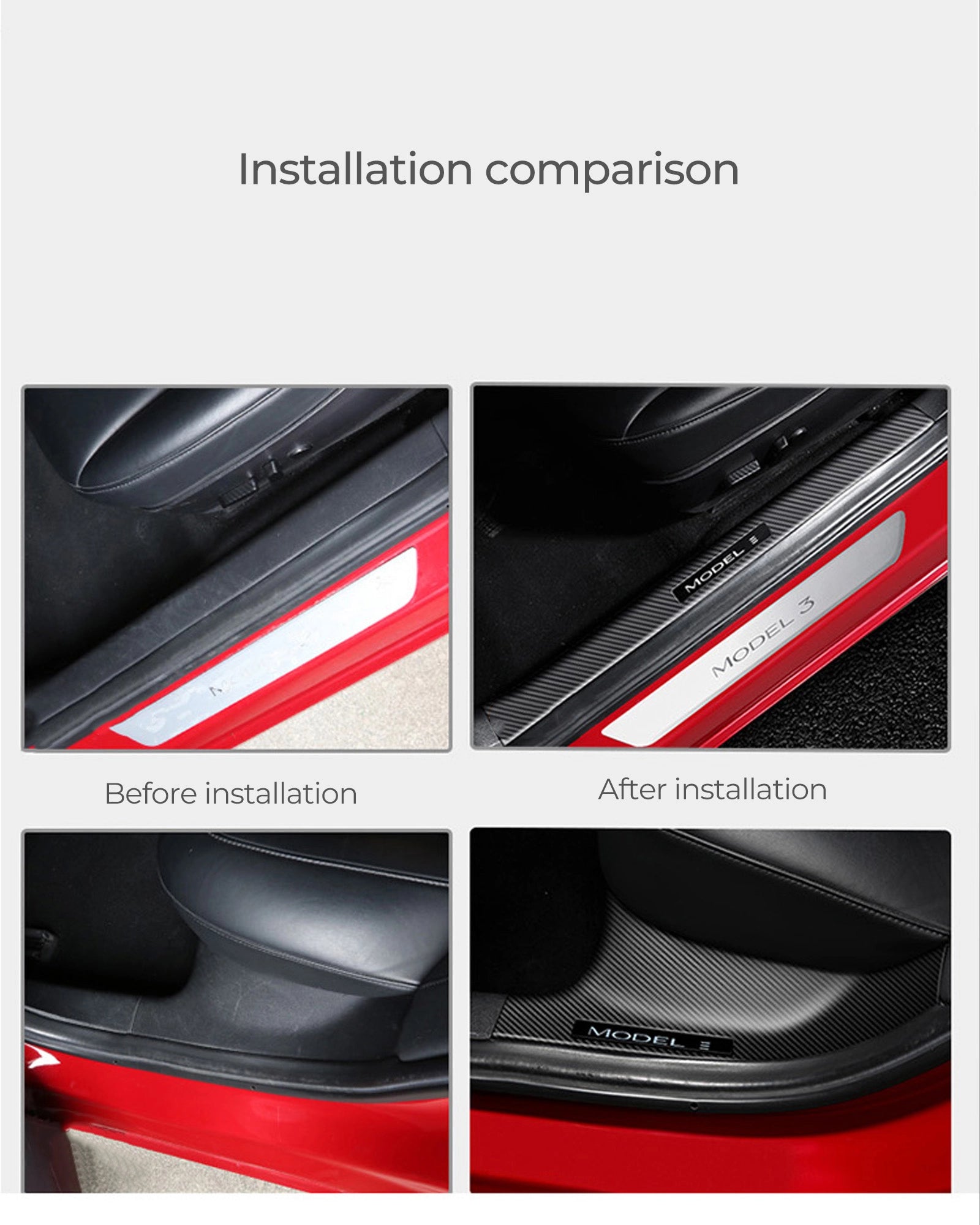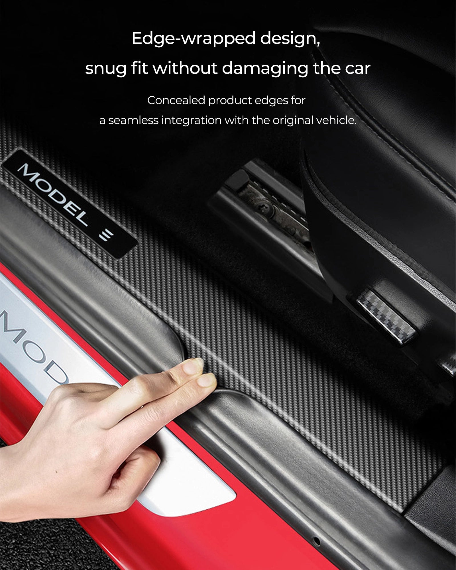 Simply clean the sills with water and a cloth, then align the corners of the carbon fiber sill protectors with the sills on your Model 3/Y and press gently to ensure the adhesive bonds securely. When it comes to replacement or removal, use a hairdryer or heat gun to apply heat to the molded carbon fiber sill protectors.