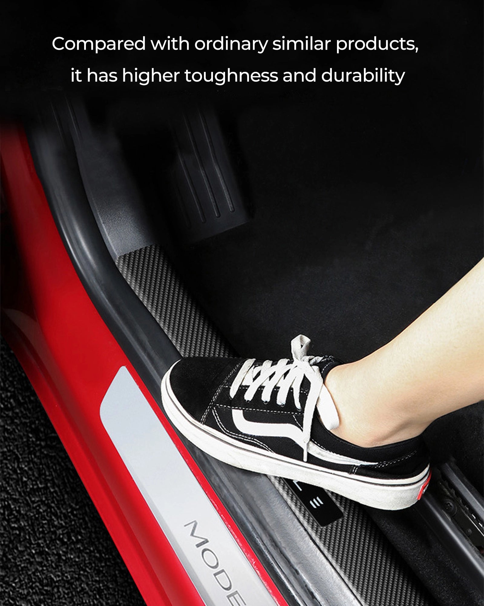 Tesla door sills are the most vulnerable part of a car; they are at risk of damage every time we step on them. Our product, the Tesla Model Y door sill protector, is designed to prevent scratches and wear on your Model Y's door sills while preserving the paintwork and not interfering with door operation.