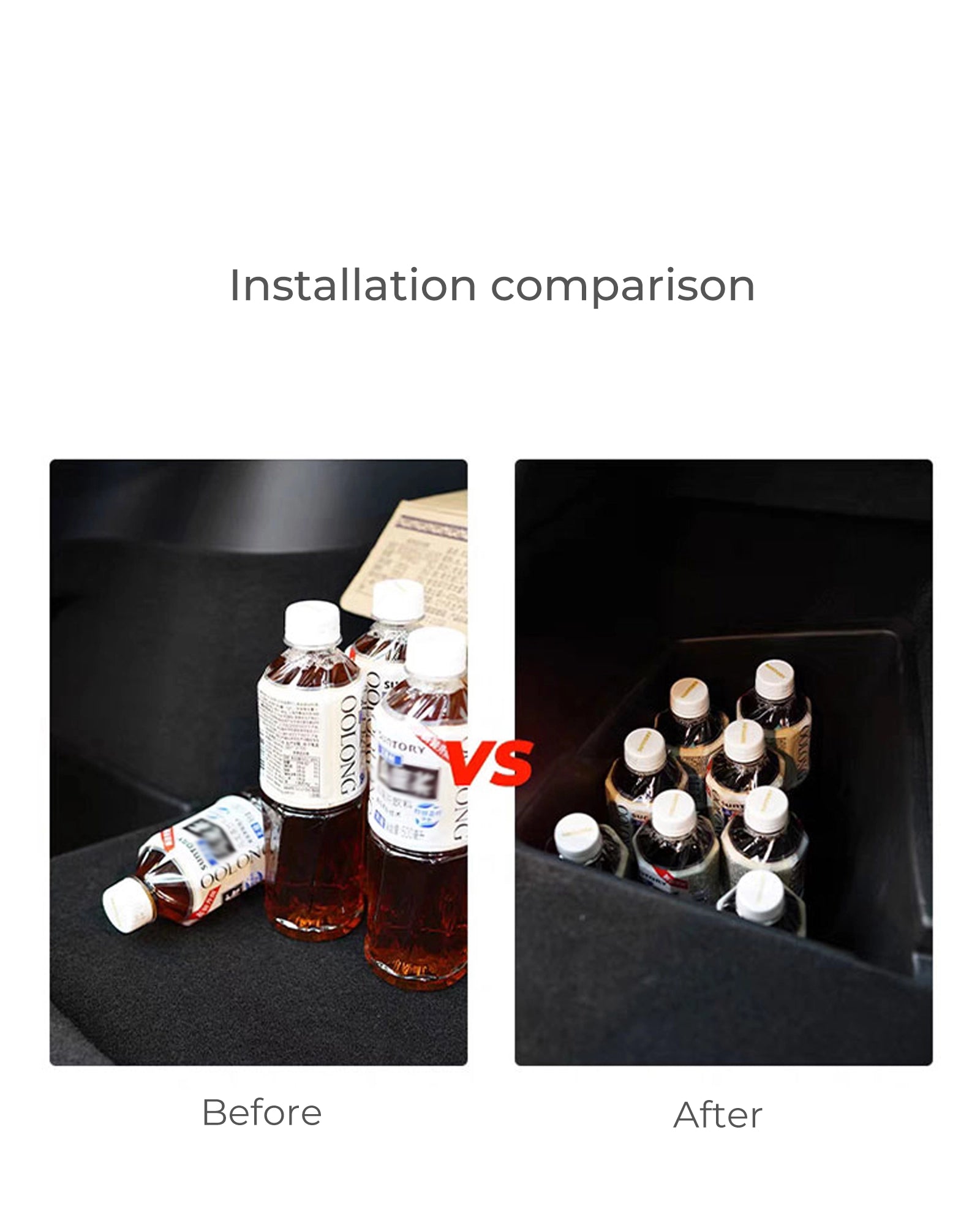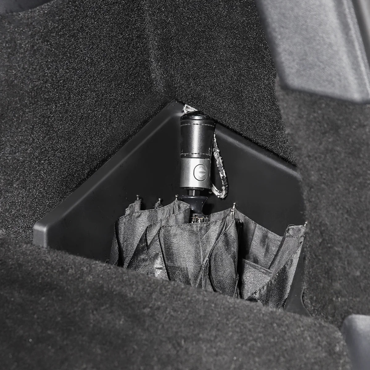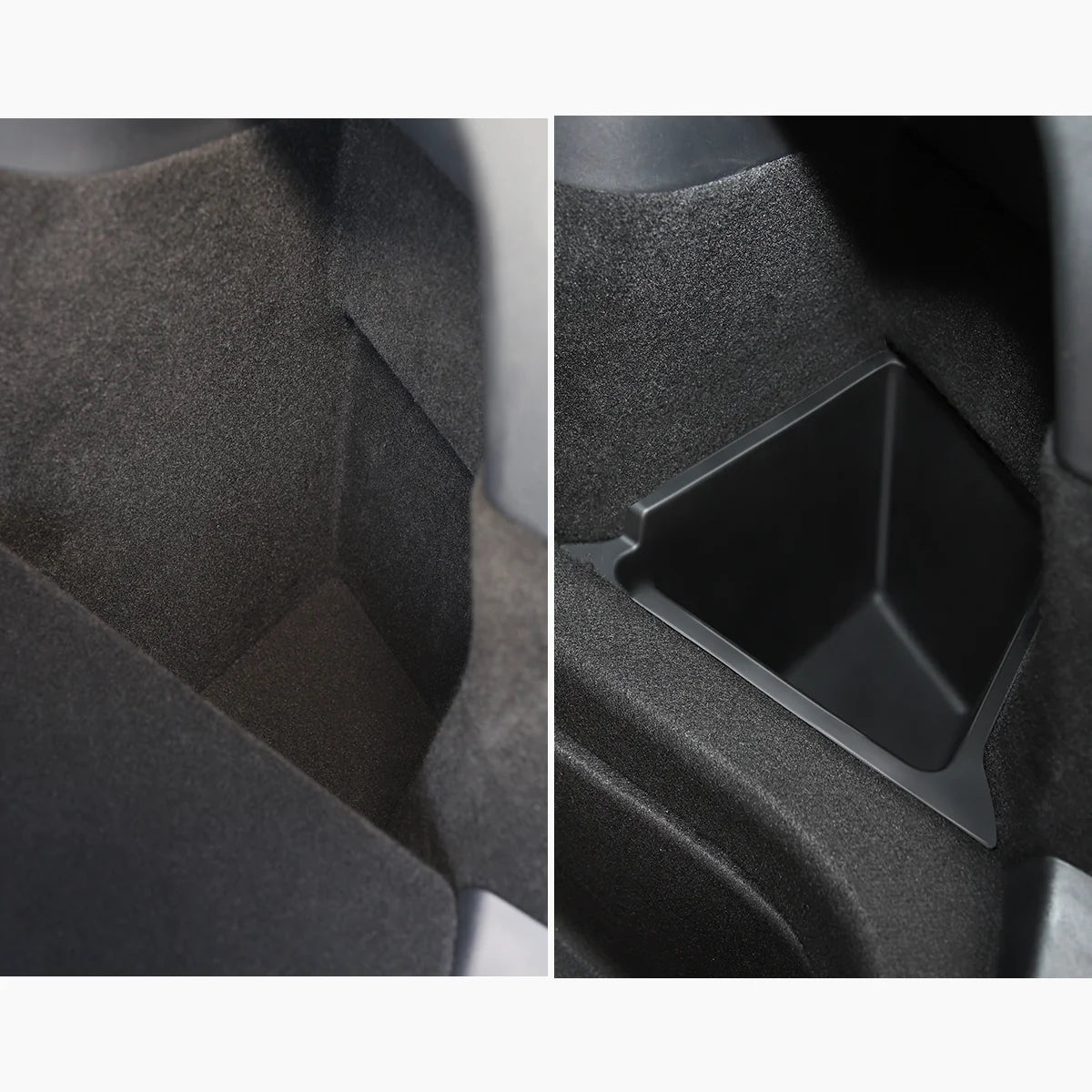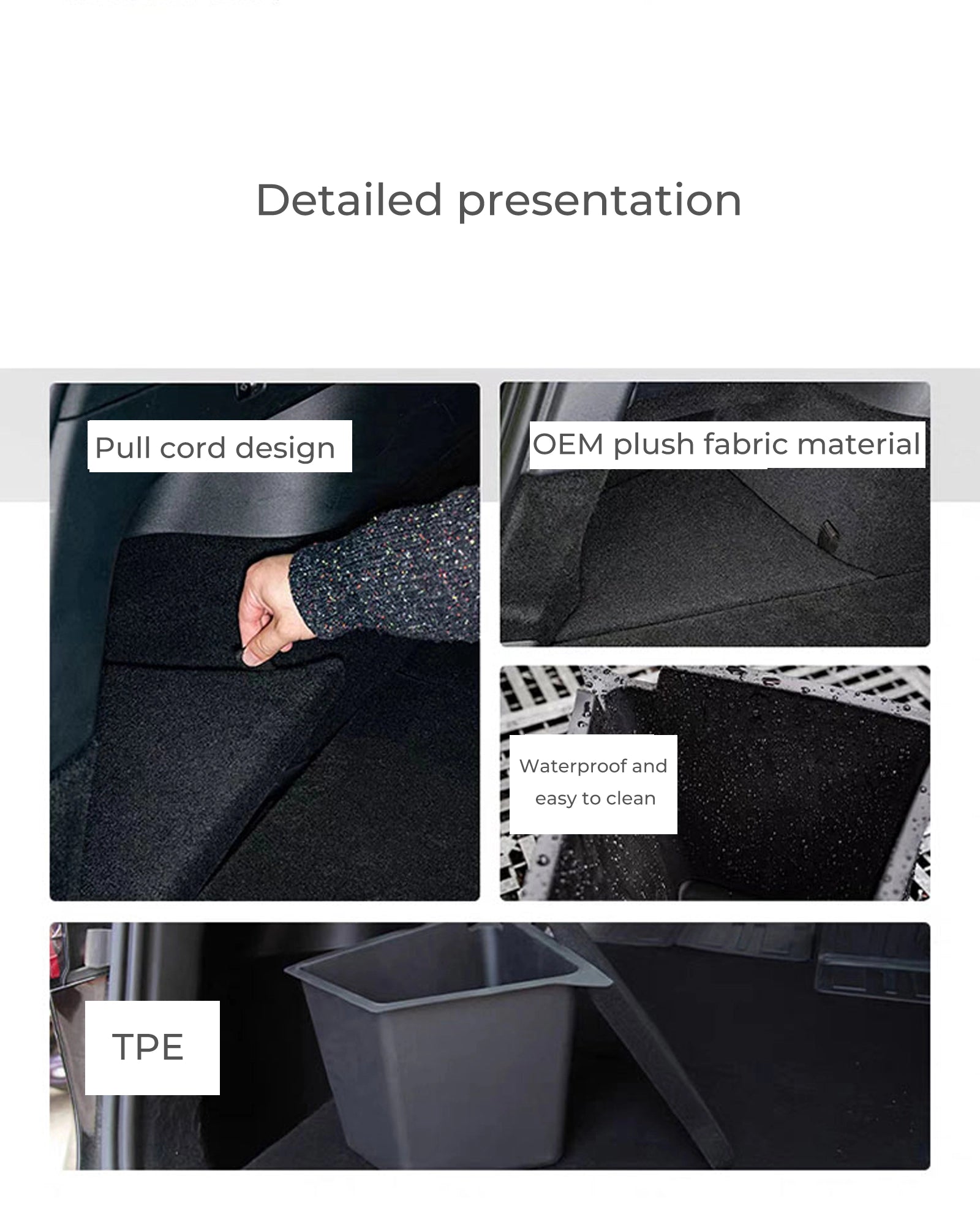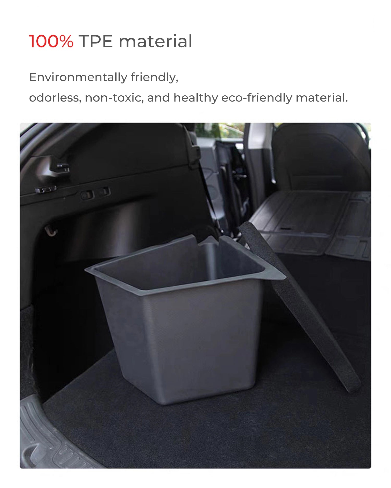 The trunk side storage box expands storage space for Tesla owners, keeping the interior tidy. It's perfect for shoes, tools, parts, tissues, water, phones, sunglasses, and more, helping keep your luggage organized. Made from TPE material, it's non-toxic, soft, dust, and dirt-resistant. Reduces noise when using items on rough roads.