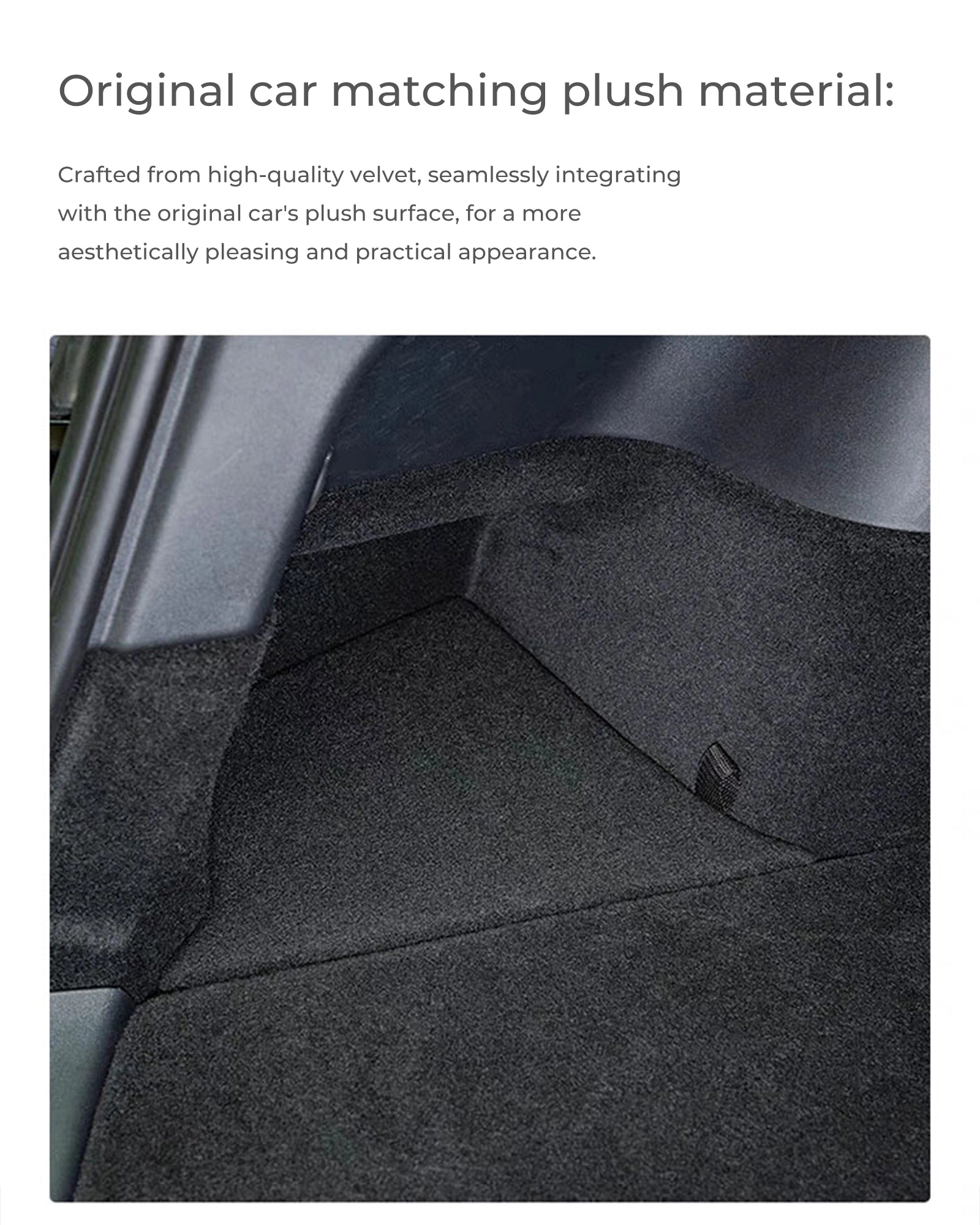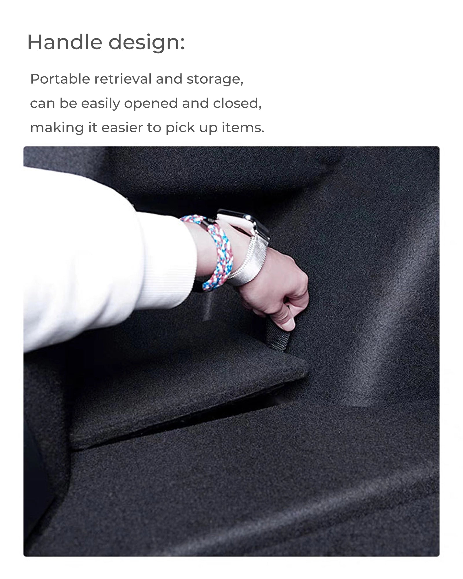 The storage box is crafted from high-quality velvety material that seamlessly blends with your Model Y's trunk. Not only does it provide excellent protection, but it also enhances the interior aesthetics. It seamlessly integrates with the car's interior, adding sophistication and tidiness to your vehicle.