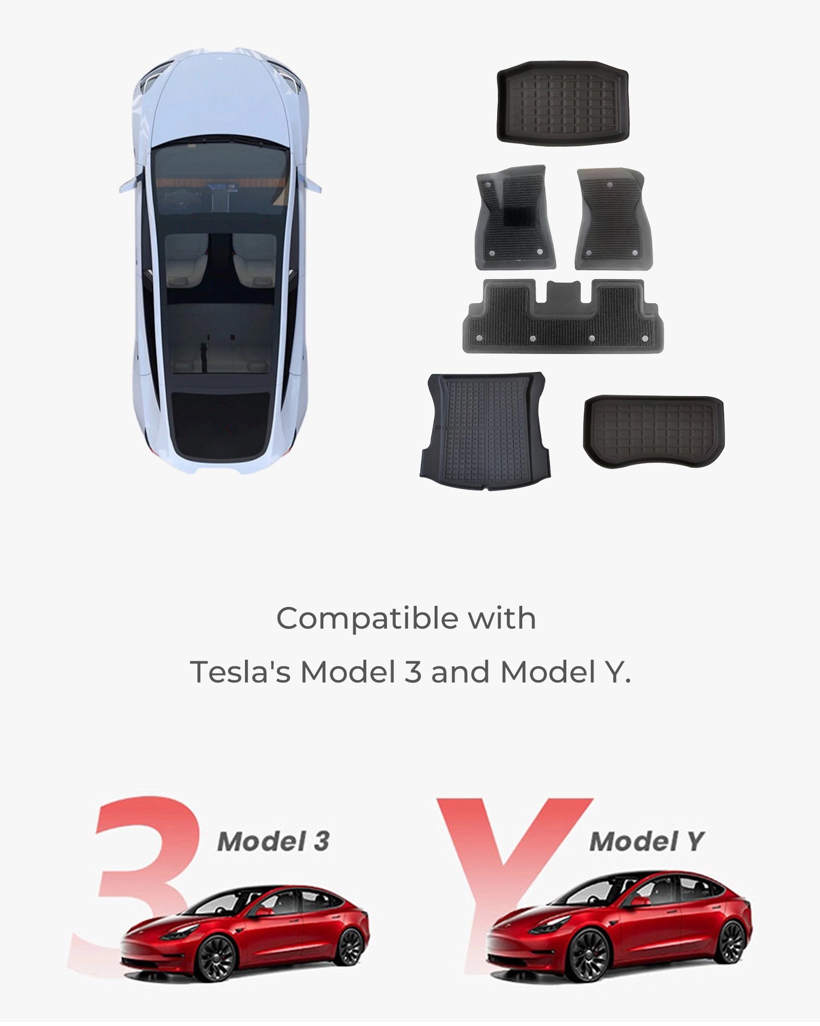 Specifically designed for Model 3/Y, including front, rear, trunk, and frunk mats, ensuring a perfect fit.