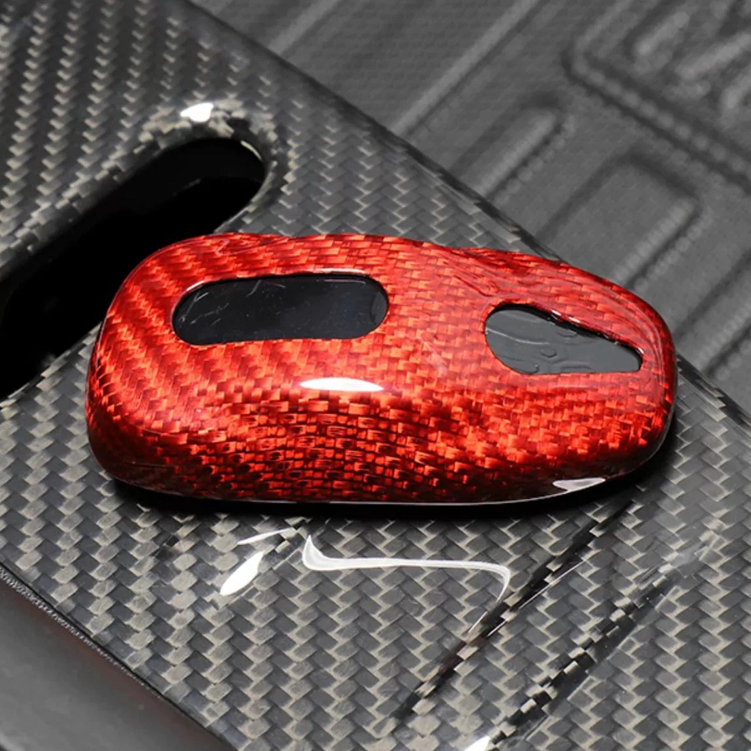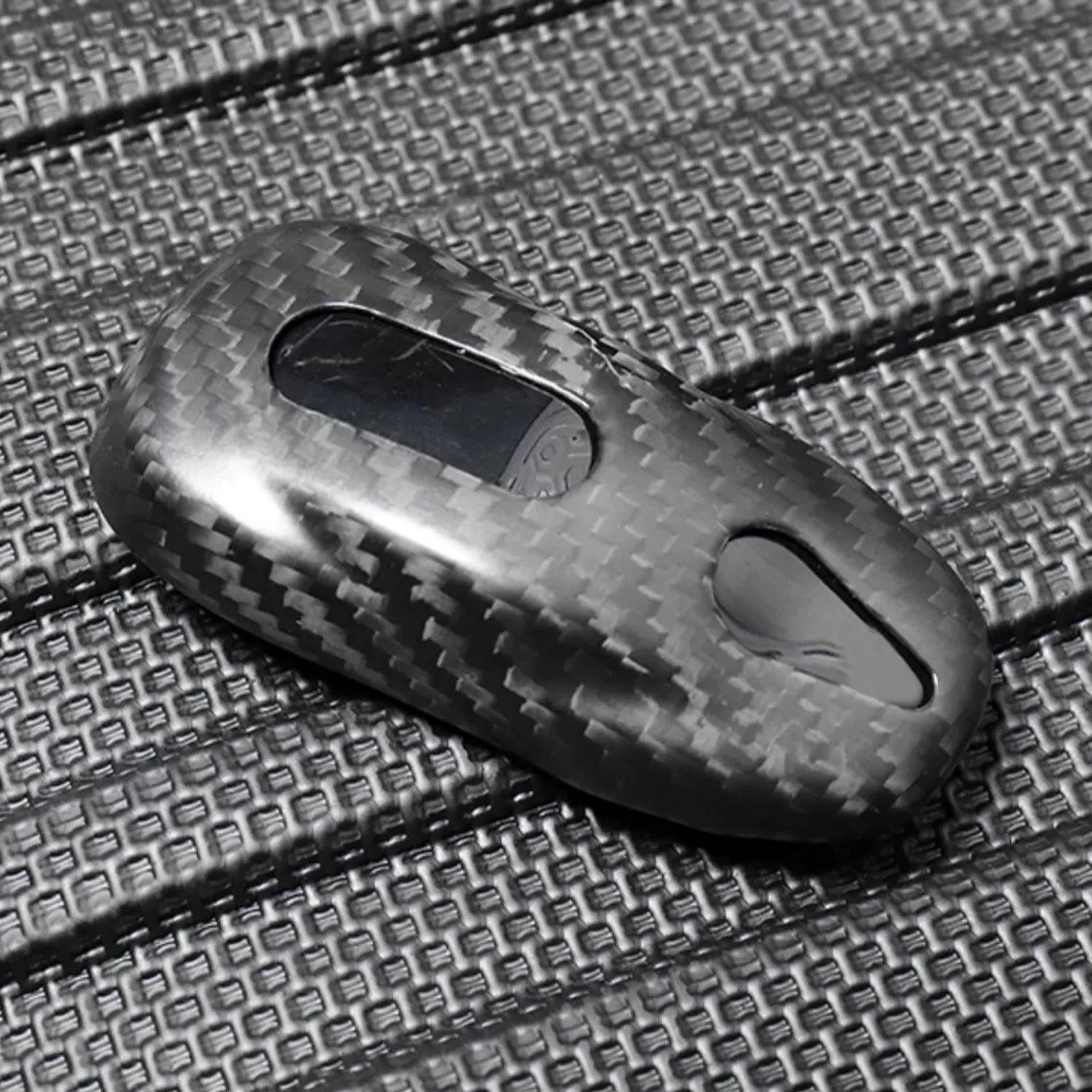 If you prioritize sporty aesthetics, durability, and lightweight design, carbon fiber is the ideal casing material. Our car key fob cover is stylishly coated in carbon fiber, a delight for Tesla owners, boasting a textured non-slip surface that outshines factory plastic or leather buttons - for a sleek look and feel.