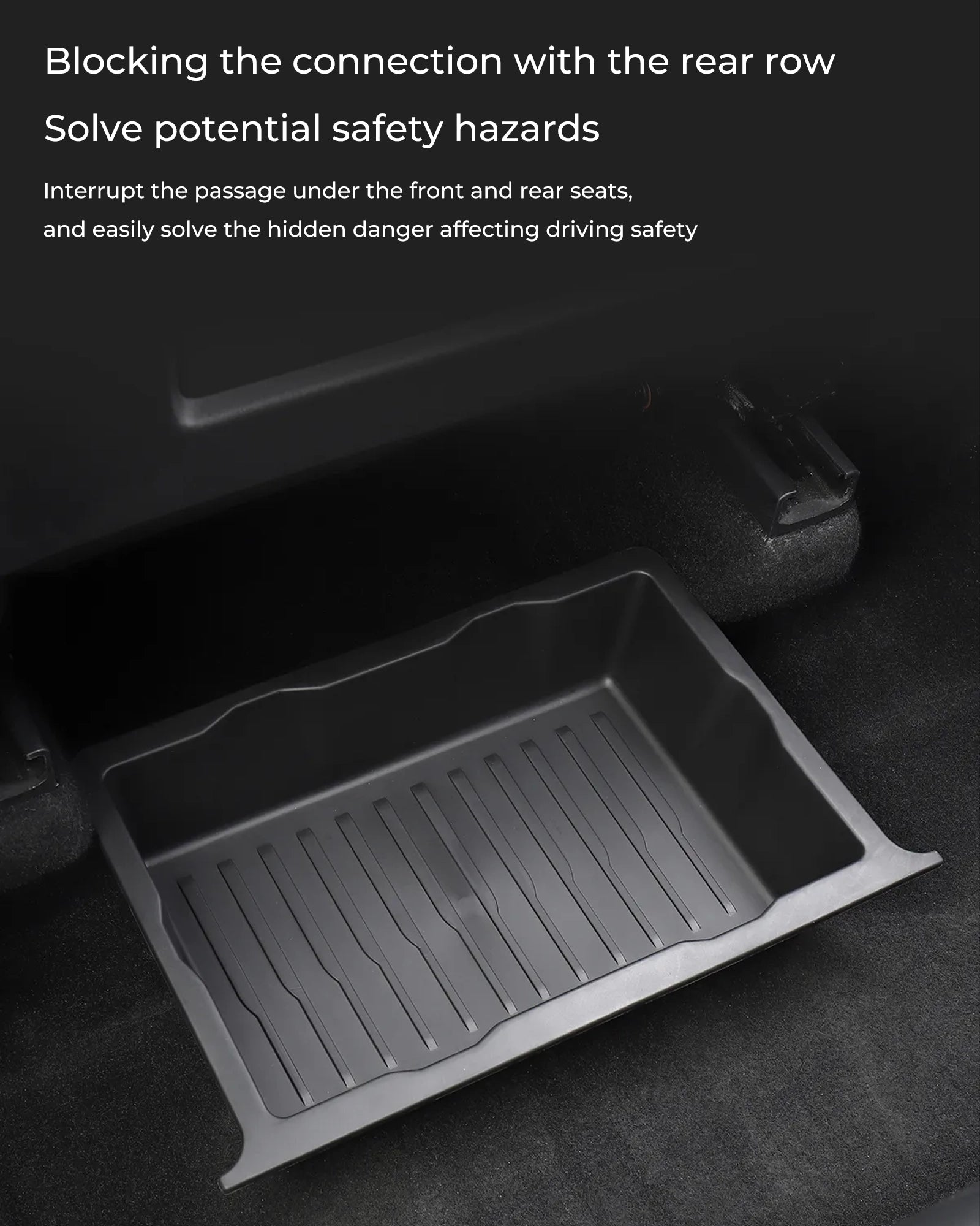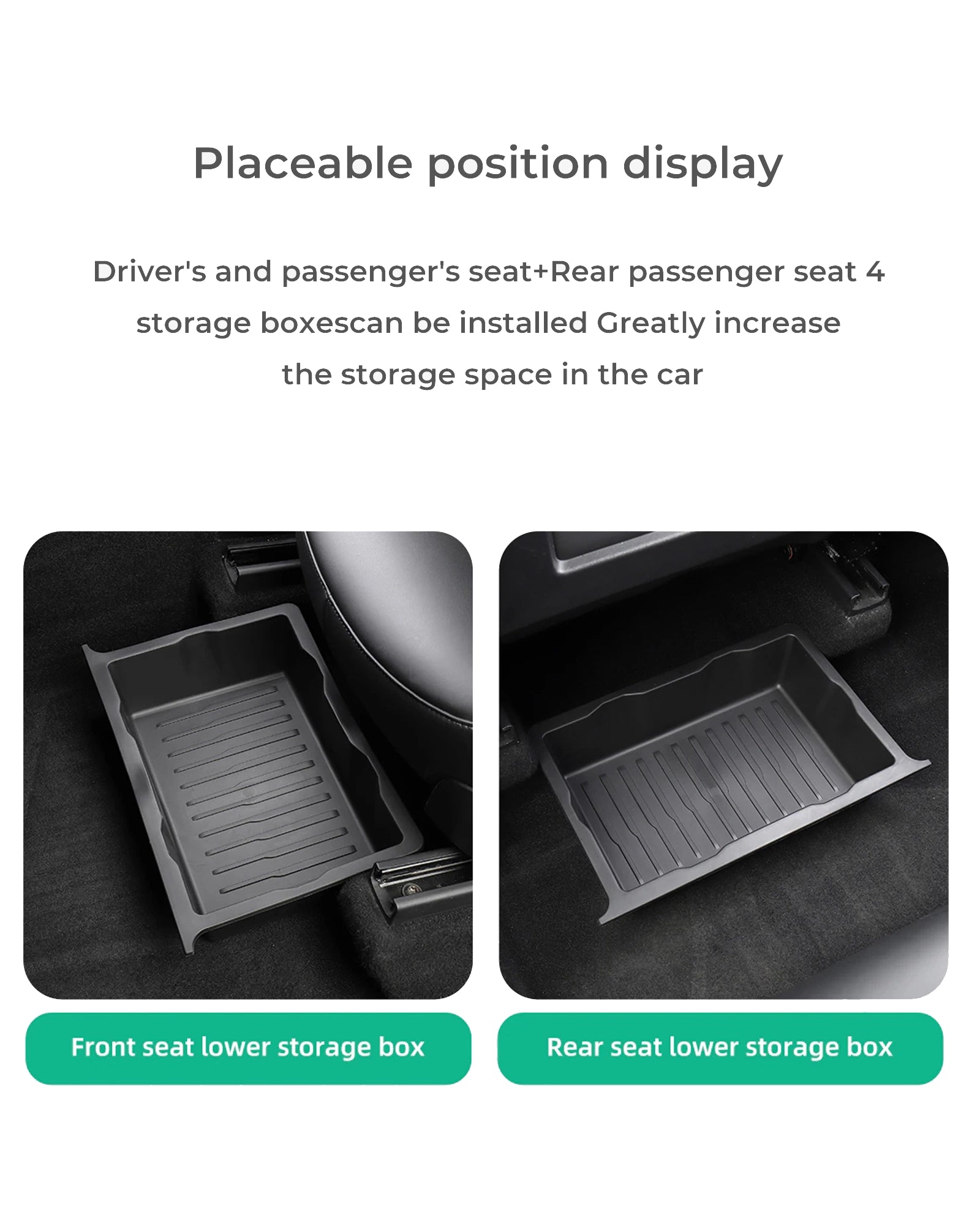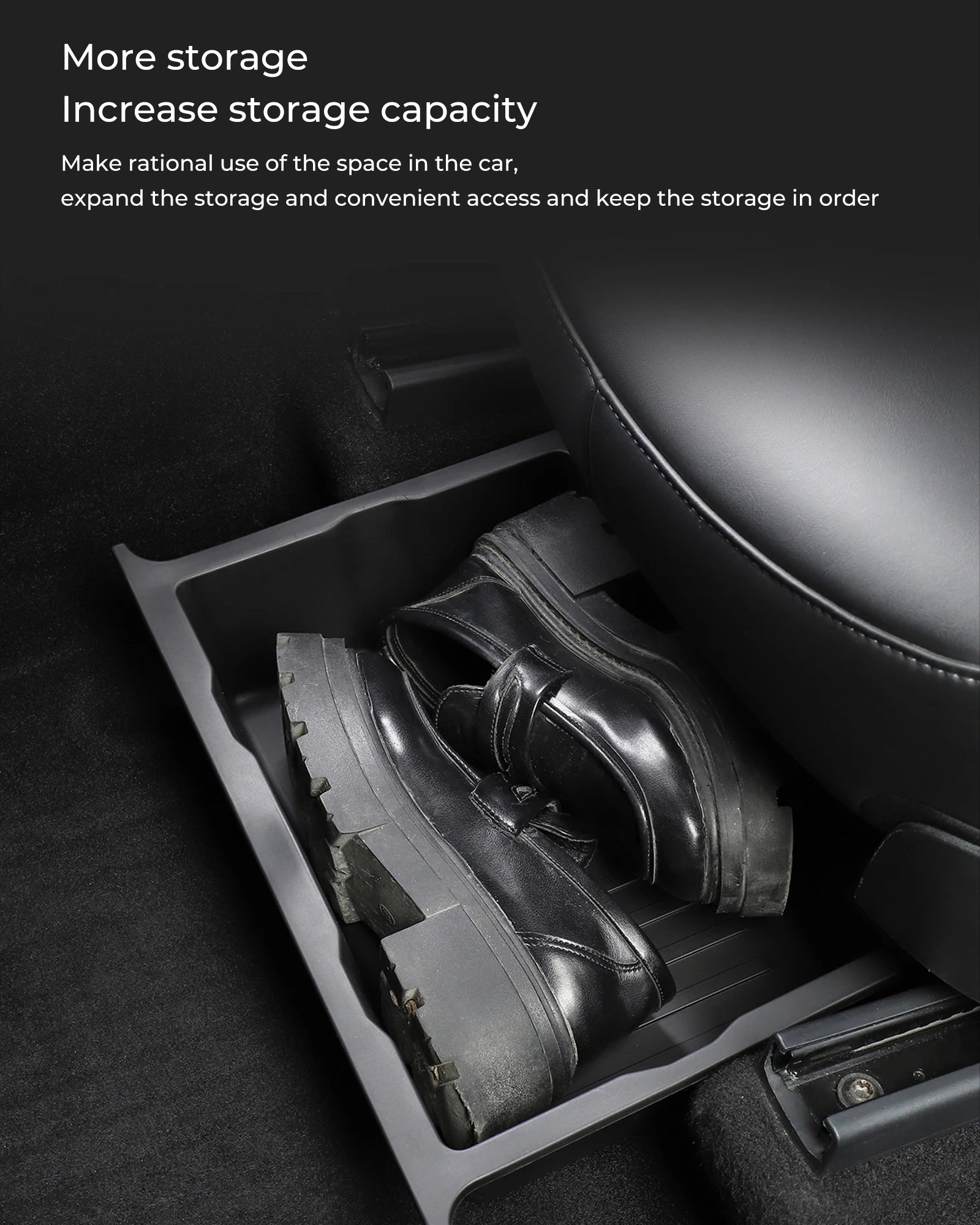 This Tesla Model Y under-seat storage box is perfect for all Tesla Model Y drivers and passengers. It is made of high-quality TPE material with a reinforced structure. The storage space is compact, so you don't have to worry about items rolling into the driving area and obstructing the gas and brake pedals. The Tesla Model Y under-seat storage box also provides additional storage space, helping you keep your Model Y organized.