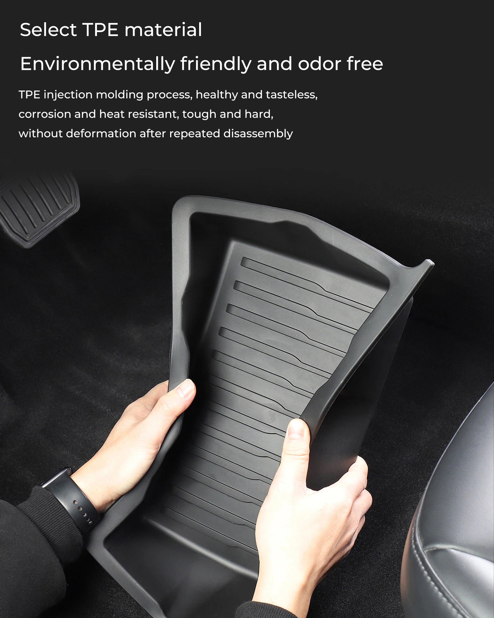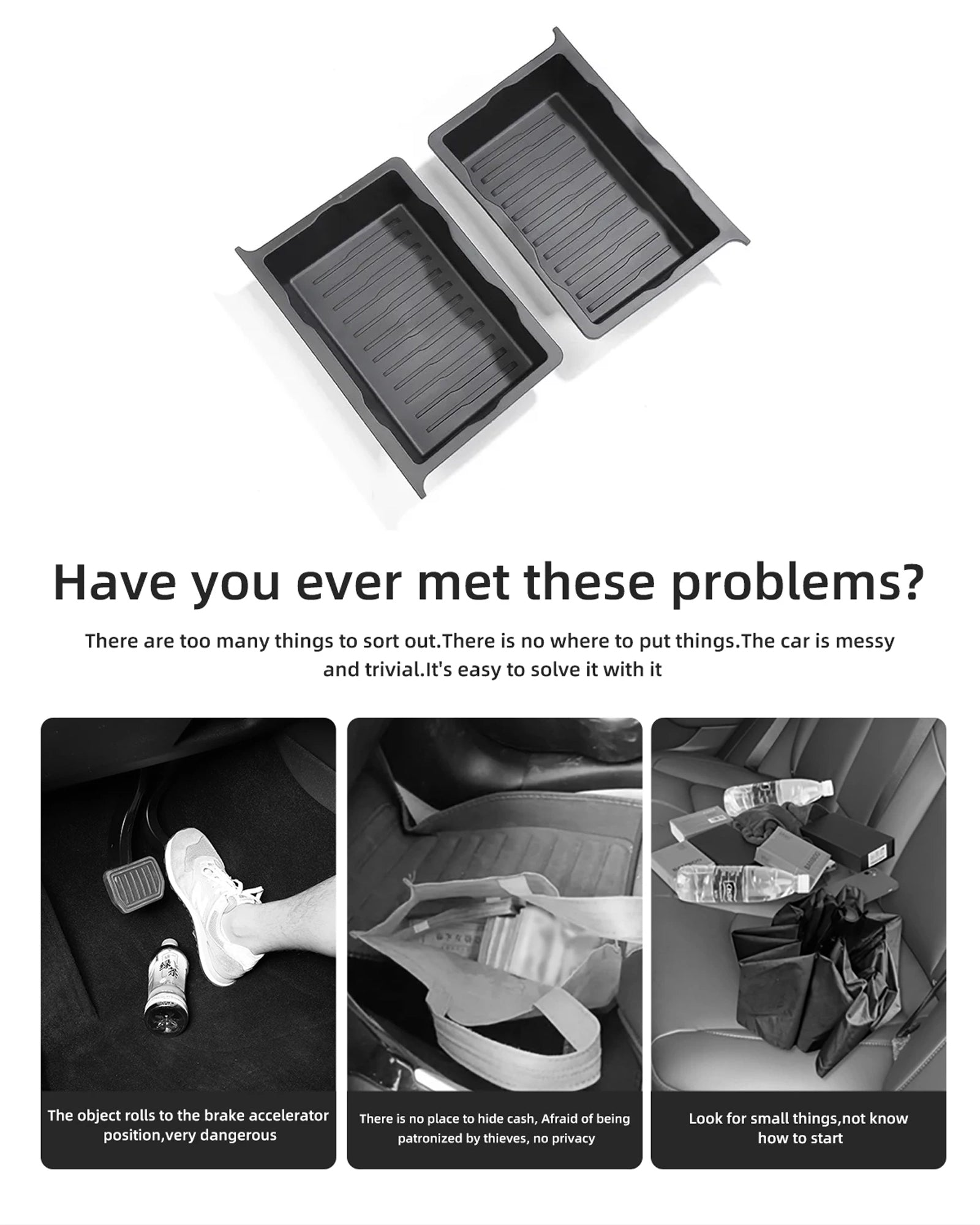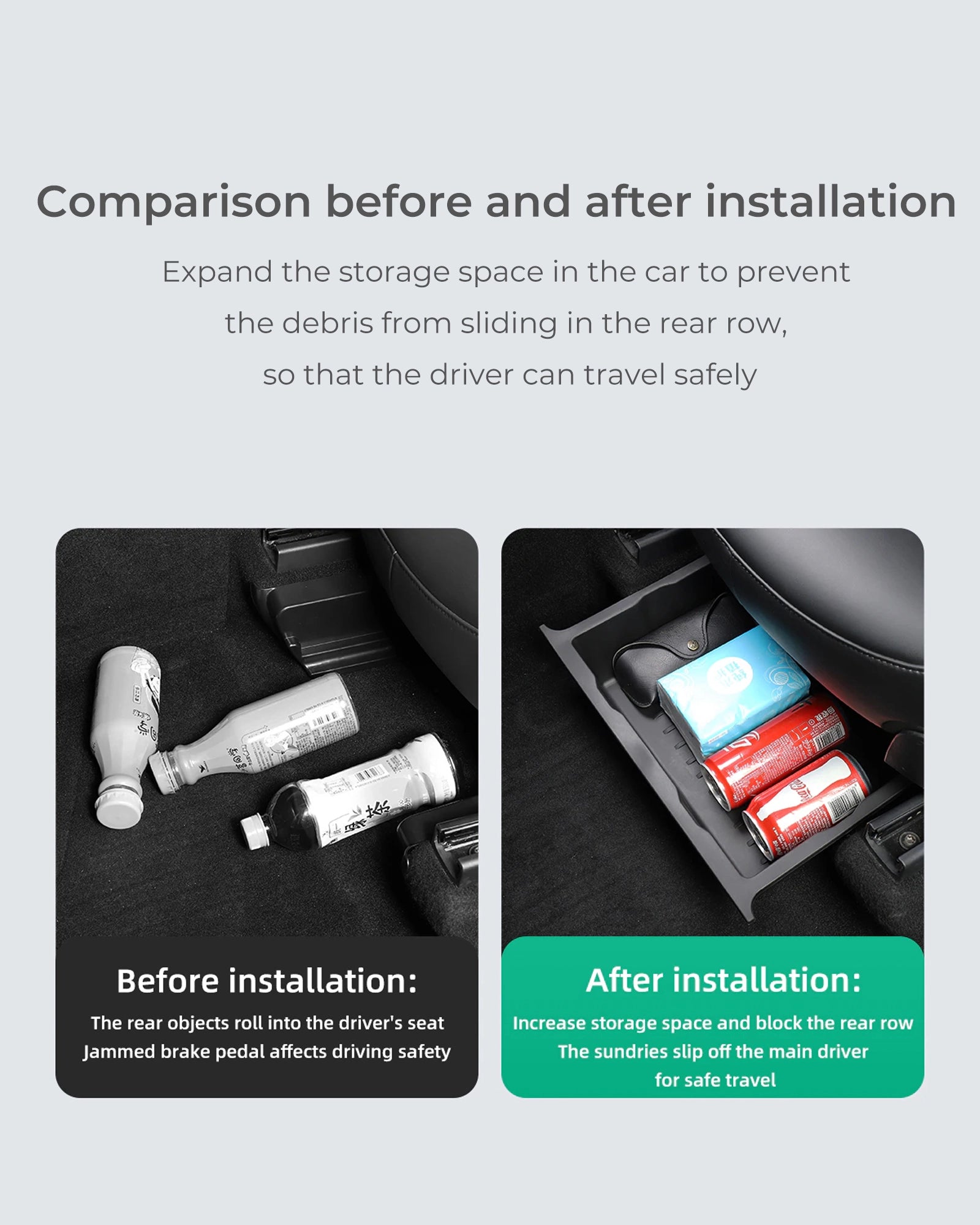 This Tesla Model Y under-seat storage box is perfect for all Tesla Model Y drivers and passengers. It is made of high-quality TPE material with a reinforced structure. The storage space is compact, so you don't have to worry about items rolling into the driving area and obstructing the gas and brake pedals. The Tesla Model Y under-seat storage box also provides additional storage space, helping you keep your Model Y organized.