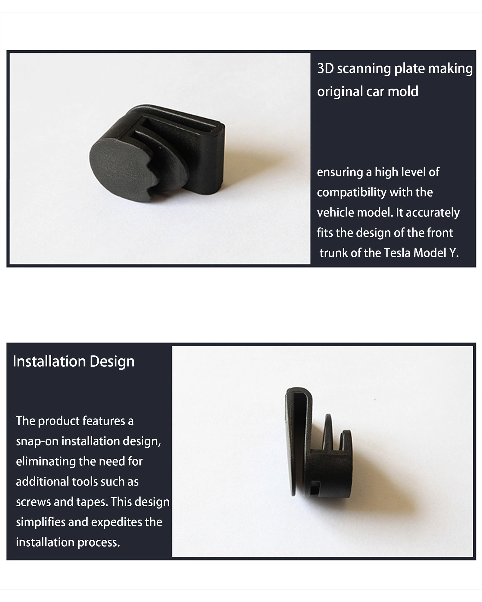 Through 3D scanning and modeling, we ensure that the product is highly compatible with the vehicle model, allowing for precise fitting to the design of the Tesla Model Y's front trunk.