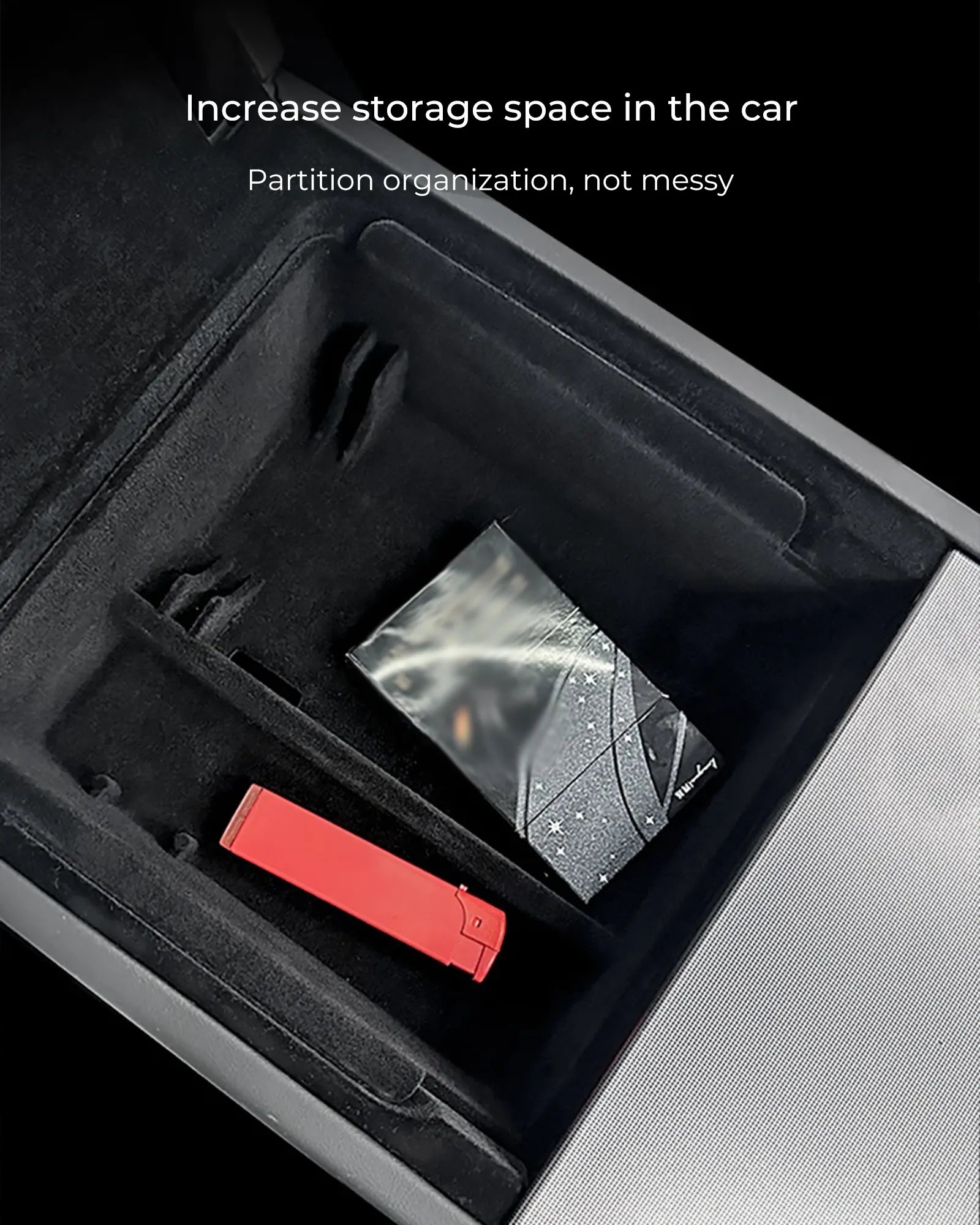 The storage box seamlessly integrates into the center armrest maintaining the aesthetics of your Model 3's interior. Its precise fit and finish reflect our commitment to quality and design.