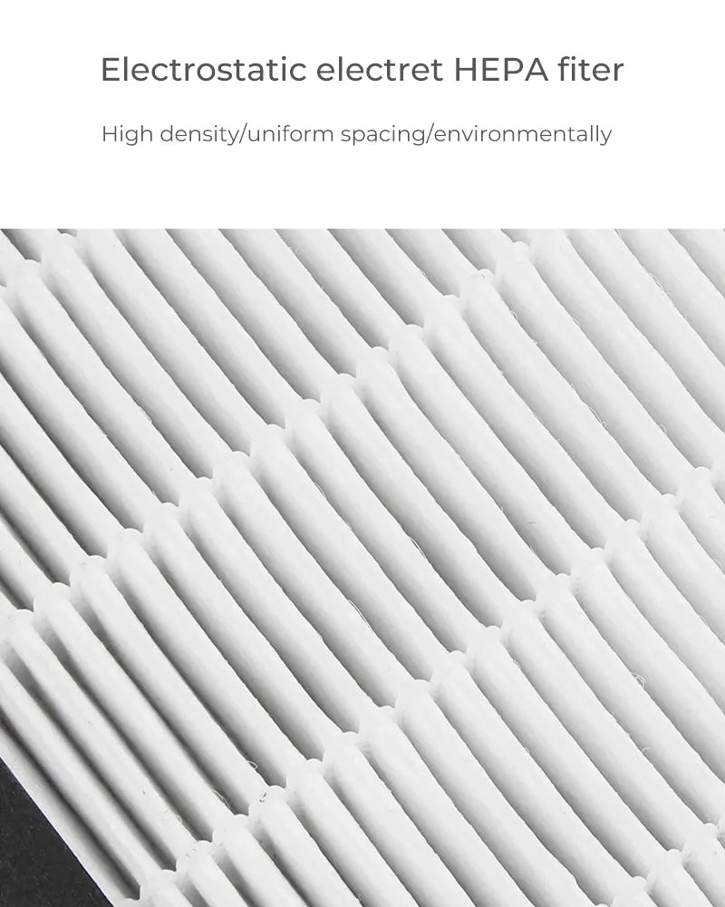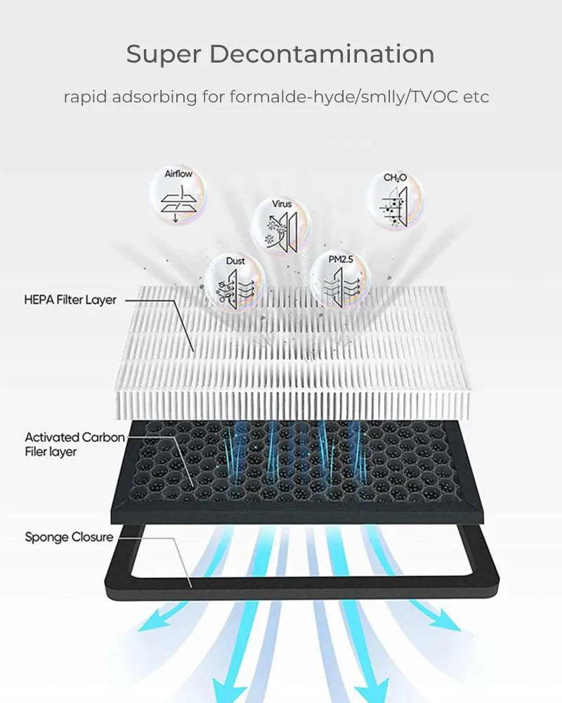 Our HEPA air purifier combines an activated CN95 carbon filter and a genuine HEPA filter, effectively capturing 99.67% of airborne particles as small as 0.3 microns. -