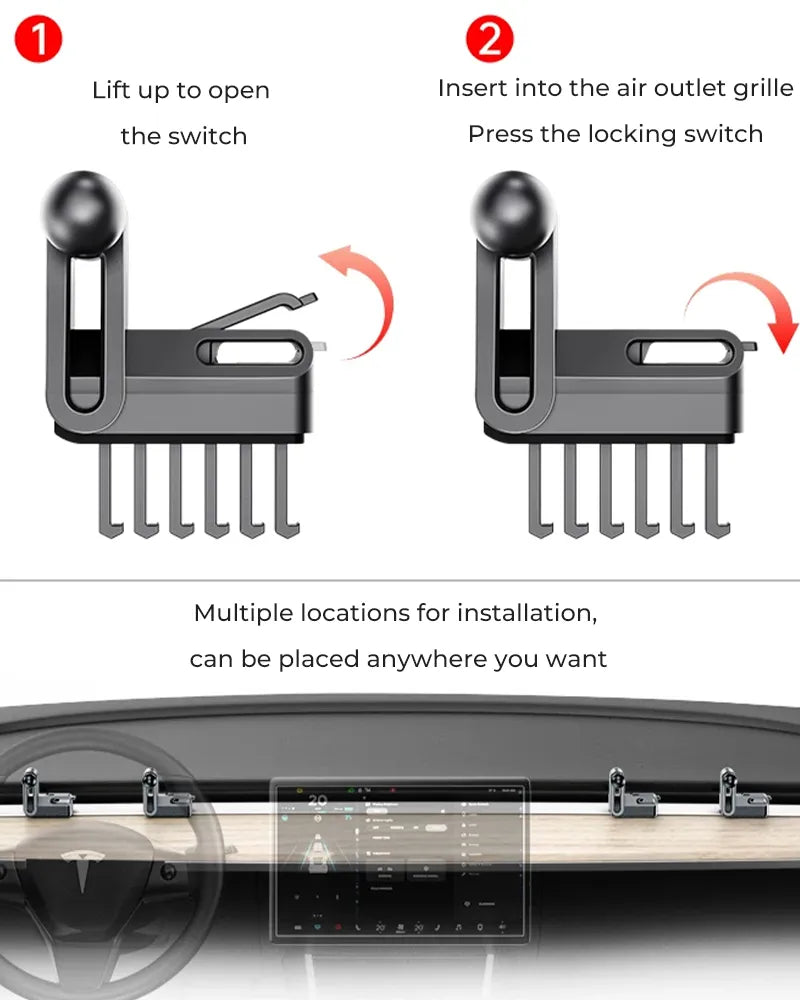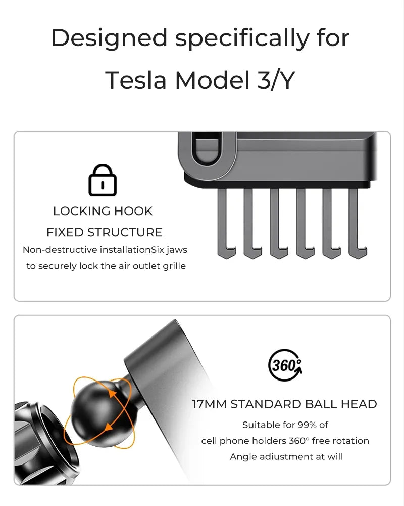 This mount is ingeniously designed to effortlessly attach to the air vent of your Tesla Model Y (2020-2023 models). As your needs change, you can easily reposition the mount by simply inserting the power connector and pressing the lock button. This intelligent design ensures your phone stays securely in place, contributing to a safer driving experience. -