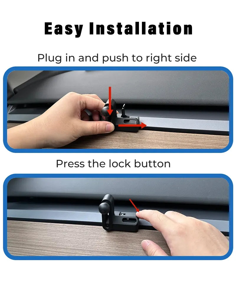 To ensure secure mounting, simply press to the right and press the lock button after inserting the power connector. This small step adds an extra layer of safety to your driving, ensuring your phone remains firmly within your line of sight.